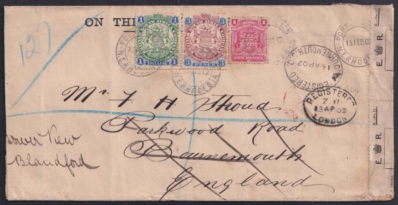 1902 (Feb 15) The British South Africa Company, Rhodesia envelope with logo in red on side flap, registered to England with BSAC Small Arms 1d rose and Large Arms Die I 3d brown & blue and 1/- green & blue tied by largely fine Nothern Rhodesia 'FORT JAMESON' cds, superb Nyasaland 'CHINDE/F/MR 6/02/B.C.A' transit backstamp, London & Bournemouth 'REGISTERED' transits on the face where repaired with a pair of 'FOUND OPEN AND/OFFICIALLY SEALED' labels plus margin, then re-directed and 'BLANDFORD/AP 14/02' arrival on the reverse, minor edge marks. Although Rhodesia joined the UPU on 1.3.1901, the overseas letter rate remained at the pre-UPU 4d per ½oz level until reduced to 2½d on 1.12.1902. Thus, the rate was triple 4d per ½oz letter plus 4d registration fee. (Image1)