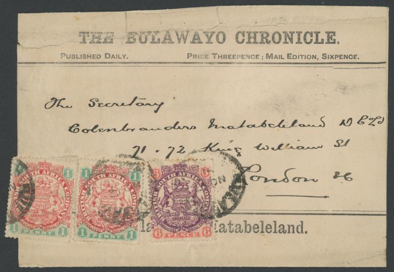 1902 (Nov 12) The Bulawayo Chronicle newspaper wrapper with annual subscription prices printed on reverse, to London with BSAC Arms Die I 1d scarlet & emerald x2 and Die II 6d mauve & rose tied by untidy Bulawayo cds, a little roughly opened at top & minor blemishes. The rate is unclear: Rhodesia joined the UPU on 1.3.1901, adopting its 1d per 2oz overseas newspaper rate. It is unlikely that this wrapper would have been able to hold 16oz of newspaper, and apparently paid double the pre-UPU 4d per ½oz letter rate. (Image1)