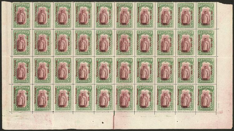 Sc.2N2, 1916 5s., large block of 40 MNH stamps (bottom part of the sheet), with several creases along perforation and some perfs separated, very fresh, very fine quality! (Image)
