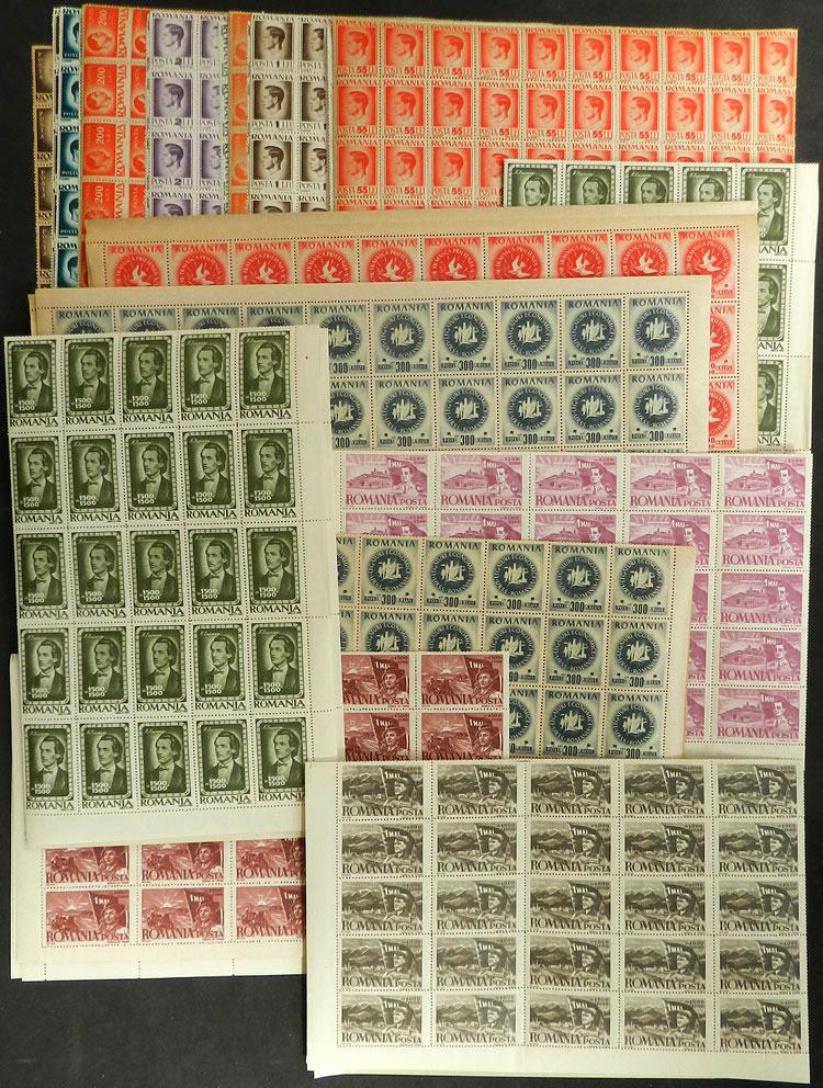 Over 3,000 stamps in complete sheets or large blocks, issued in 1940s, MNH and of very fine quality! (Image)