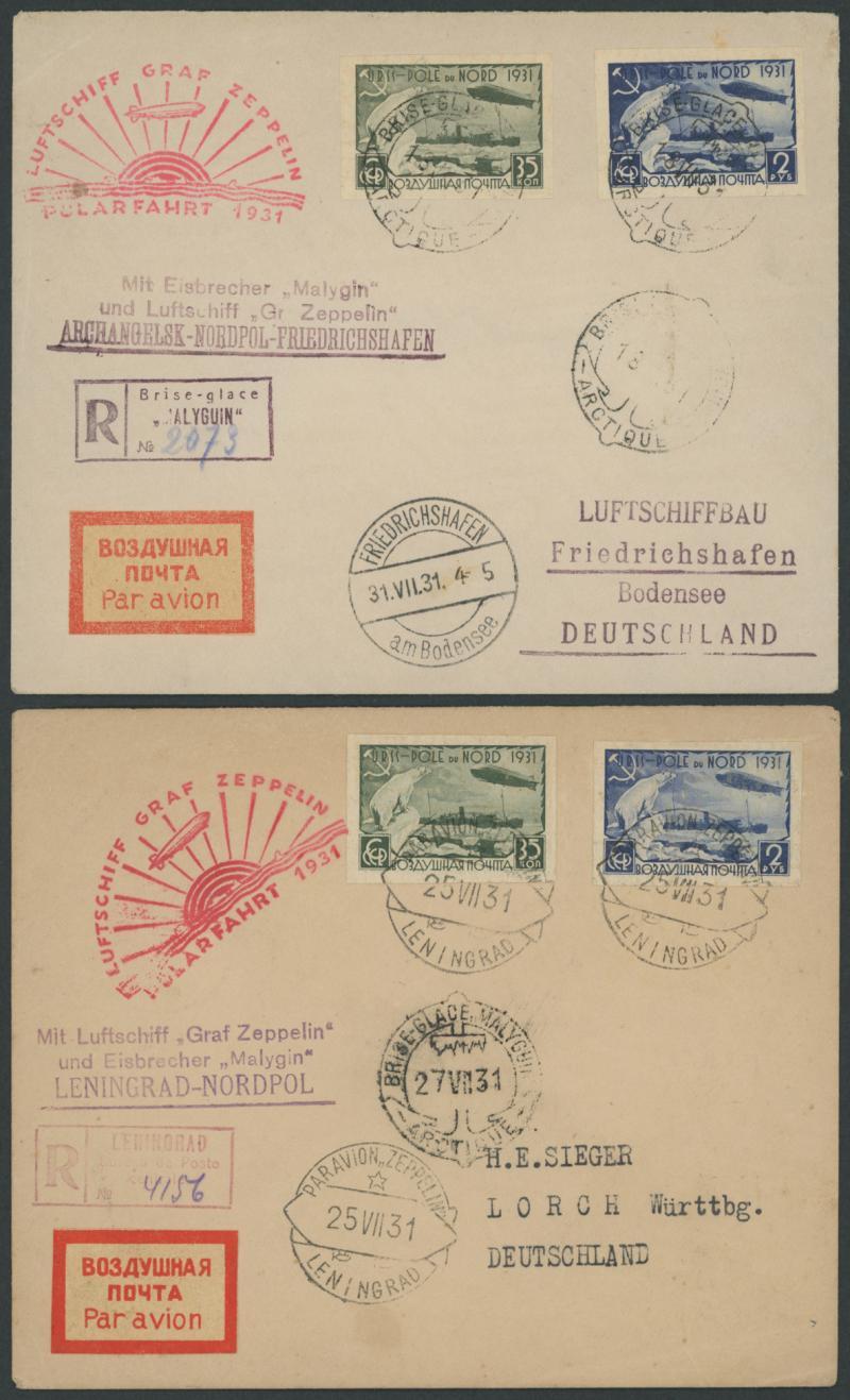POSTAL HISTORY: 1931 (July 18) two envelopes per German airship 'Graf Zeppelin' with 'LUFTSCHIFF GRAF ZEPPELIN/POLARFAHRT 1931' flight cachet in red and by Russian ice-breaker ship 'Malygin' with Russia Airmails imperforate 35k green & 2r blue, the former with the stamps tied by 'BRISE-GLACE MALYGUIN/ARTIQUE' ship-board cancels, boxed 'R' cachet & 'Mit Eisbrecher ...' handstamp and Friedrichshafen '31.VII.31' arrival, the latter with the stamps tied by 'PAR AVION ZEPPELIN/LENINGRAD' cancels, boxed 'R' cachet & 'Mit Luftschiff ...' handstamp and ship-board arrival, each with a few minor blemishes. (2) (Image1)