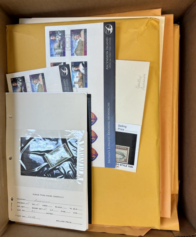 British Colonies Accum early to 1970s-80s, */O/C several colonies in individual large envs containing many (100s) ea, good mix w/ some dup, much later in NH sets or S/S, colonies include: Aitutaki, Ascension Is, Cocos, Christmas Is, Cook Is, Cyprus, Gibraltar, Kiribati, Mauritius, Niue, great for bourse or eBay dealer or general collector, H/NH (Image)