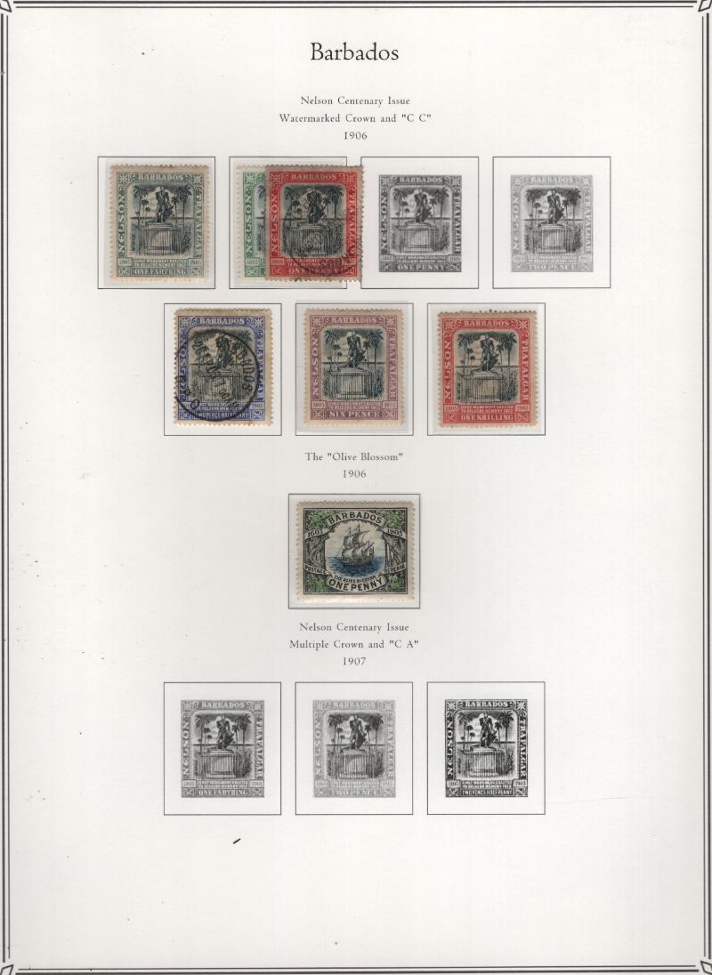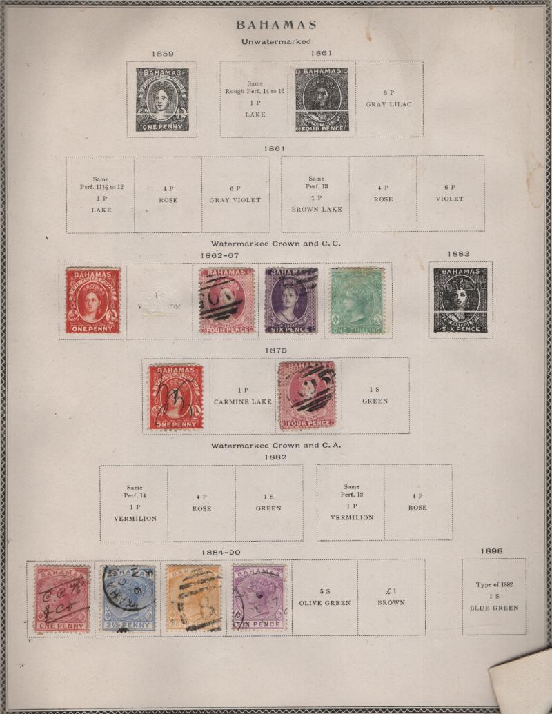 Collection in Scott album (1000+) */O owner IDed incl Bahamas 1862-1985 unused #11, 33, 35, 39, 41, 65-69, 92-95, 110, 112, 116-29, 132-47, 158-73, 185-200, 204-18, 252-66, 362-65a, 370-73a, 426-43, 492-95a, 539-42a, 568, MR13, used #13, 14, 15, 16, 18, 30, 46, 51, 54, 55, 83, 90-91, Barbados 1861-1985 unused #61, 74, 76, 78, 81, 85, 90, 92, 96, 99, 100, 109, 116-23, 132, 165-79, 216-27, 267-80, 328-43, 495-511, 570-72, 602-05, 623-26a, 665-68, 670-74 used #15, 19, 21, 24, 25, 26, 28, 32, 38, 41, 44, 47, 48, 52, 53, 63, 66, 67, 130 & so much more, also a group of stamps from Belize but some lower value are stuck down from a coffee spill on top of the pgs, Belize is not counted in value of album at all, few flts but mainly F-VF (Image)