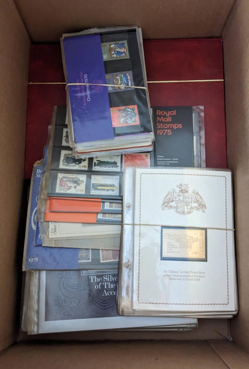 Accum GB presentation packs, (100s) Commonwealth stamps & sets on stock cards, dealer cards, glassines, some earlier but mostly QEII; stash (100s) GB FDCs 1970s-2000s, most addr; loads of value, gen F-VF