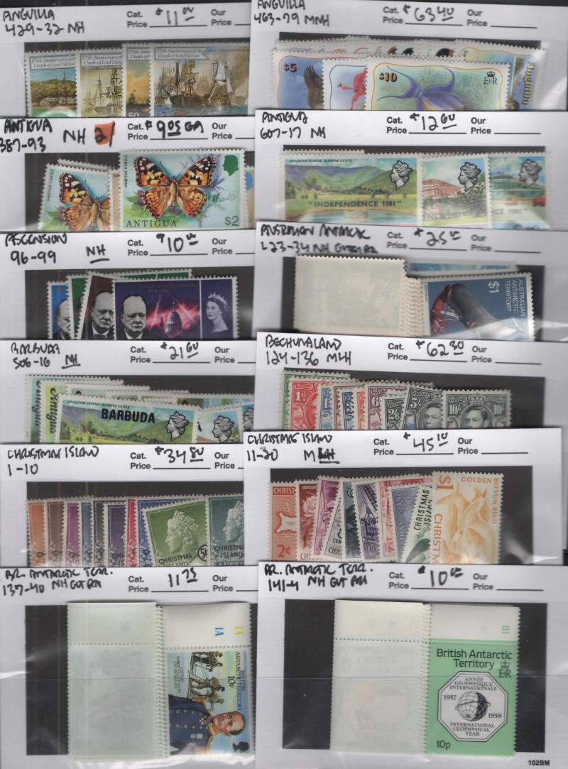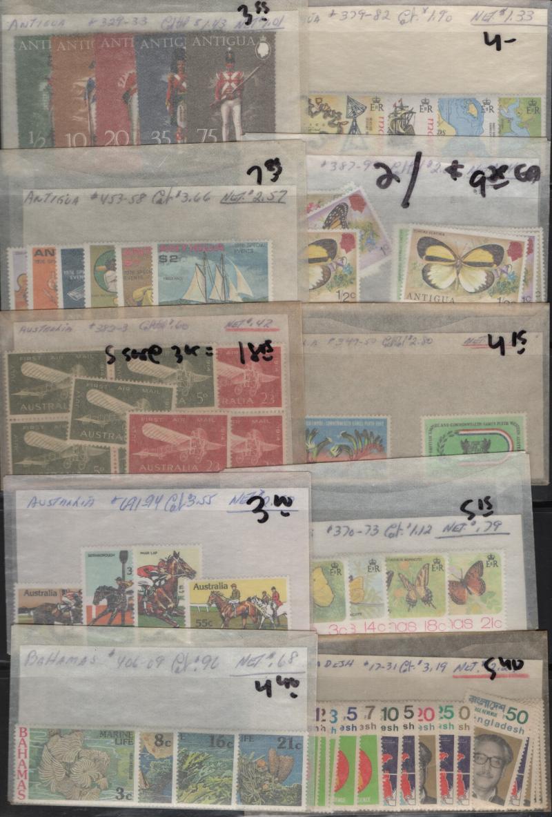 Accum (1000s) mostly unused 20th Cent on dealer & stock pgs & abt (1300+) IDed glassines incl Unused: Antigua #379-82, 387-93 (2), 453-58, Australia 349-50, 382-83, Bahamas 370-73, 406-09, Bangladesh 12-31, Barbados 348-52, Bermuda 318-21, 355-59, Br Honduras 131-36, Cayman Is 386-91, India 323 (7), Ireland 1300A (2), 1339A (5), 1439-42, 1491, 1509A (5), 1510, 1659A (4), 1659B (2), New Zealand 218-22, B18-19, Tristan Da Cunha 151-61, Zanzibar 214-17 & much more; some light dup, gen F-VF H/NH (Image)