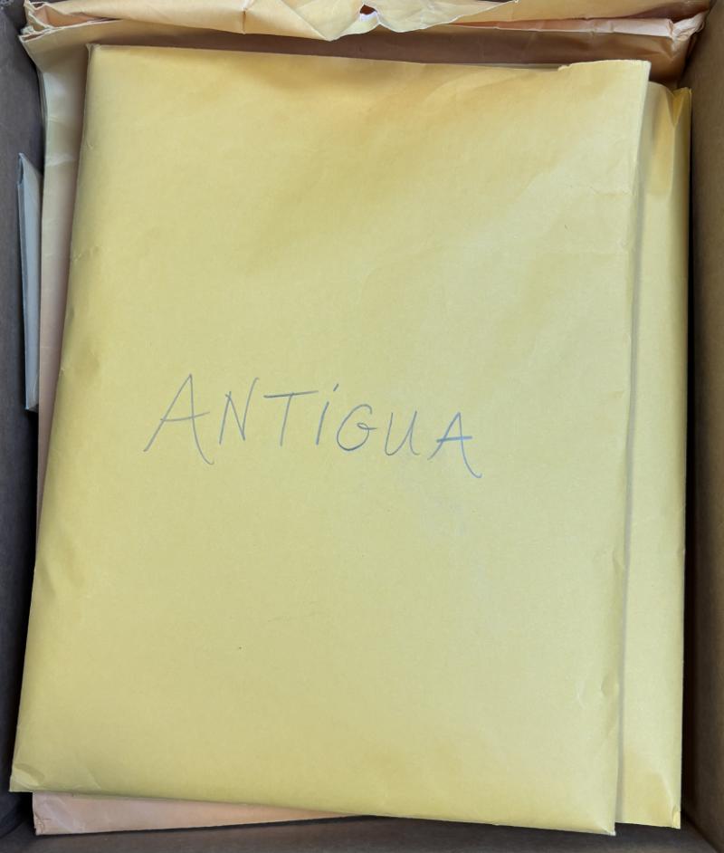 British Colonies Accum early to 1970s-80s, */O/C, several colonies in individual large envs containing many (100s) ea, good mix w/ some dup, some earlier FDC, much later in NH sets, colonies include: Anguilla, Antigua, Barbados, Bahamas, Cayman Is, Leeward Is, etc, great for bourse or eBay dealer (Image)