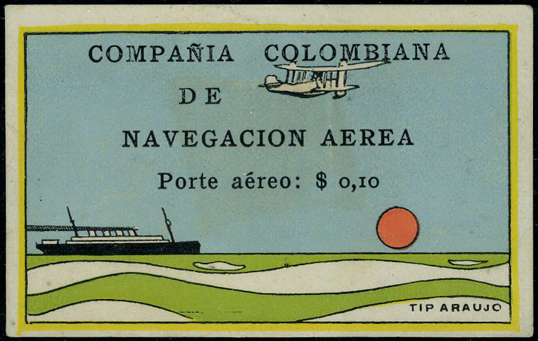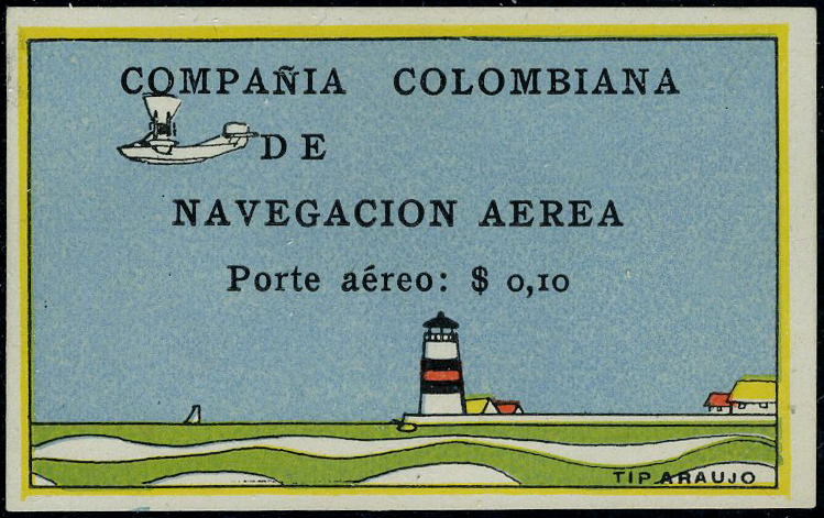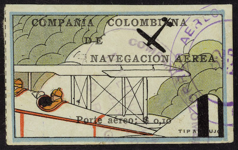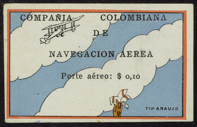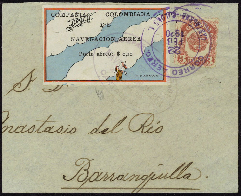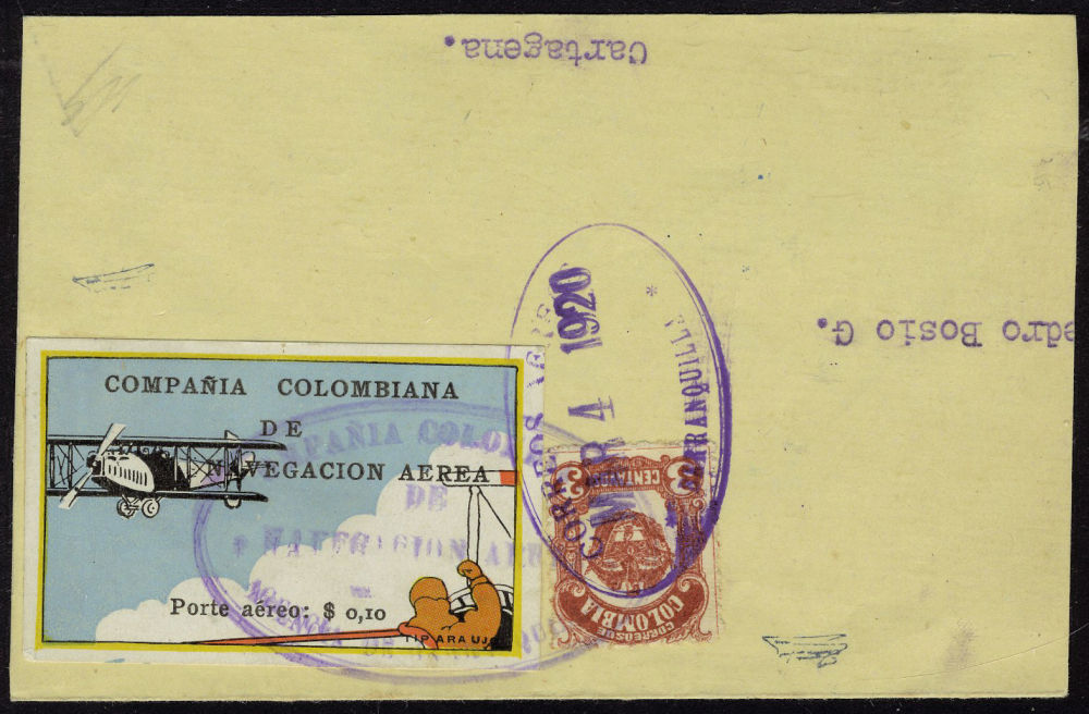 N° 2A, 10c vignette multicolore sur fragment de lettre obl Cartagena 22 fev 1920 1er jour, arrivée à Barranquilla le 23 fev, signé Champion + certificat Holcombe + certificat Colomphil, T.B. rare (Image)