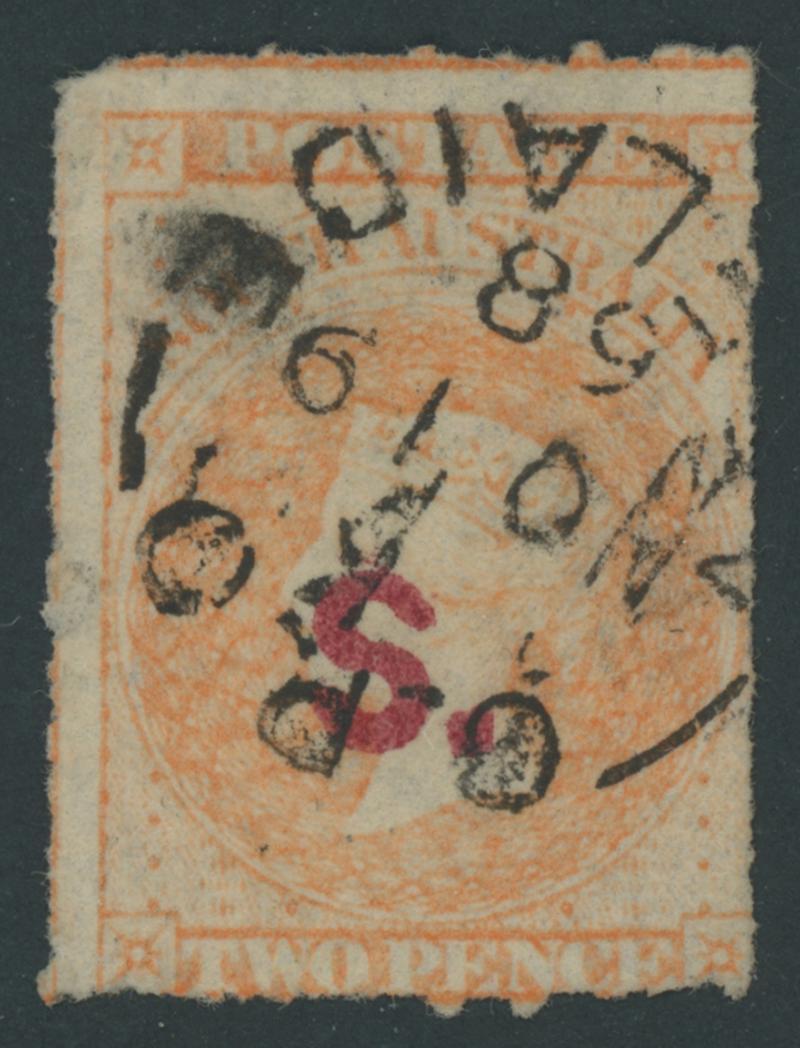 BLACK OVERPRINT: 'S.' on QV De La Rue Crown/SA Wmk Perf 10 2d dull orange SG DO497, unusually well-centred, GPO circle-in-bars cancel, Cat £100. Rated R; unrecorded unused. Don Pearce's superb example sold for $180 (Sale 247 Lot 707). [Date range 17.6.1872 to 25.4.1877] (Image1)