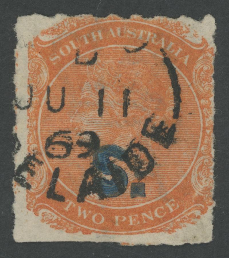 BLUE OVERPRINT: 'S.' on QV De La Rue Crown/SA Wmk Rouletted 2d orange SG DO491, rouletting on all sides, GPO cds of 'JU11/69', Cat £150. Rated RR. More attractive than the 'Besancon' and Don Pearce examples that sold for SF181 and $252 (Sale 247 Lot 703) respectively. [Date range 25.5.1869 to -.-.1872] (Image1)