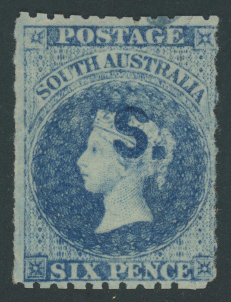 BLUE OVERPRINT: 'S.' on QV Perkins Bacon Large Star Wmk Perf 11½-12½xRoulette 6d bright pale blue SG DO492, light horizontal wrinkling at the base, unused, unpriced unused by Gibbons. Rated RRRRR. Ex Baron von Ferrary, Theodore Champion and Philip Croker. Chris Ceremuga Certificate (2009) states "extremely rare". Absent from the Vestey, 'Besancon' and Don Pearce collections. (Image1)