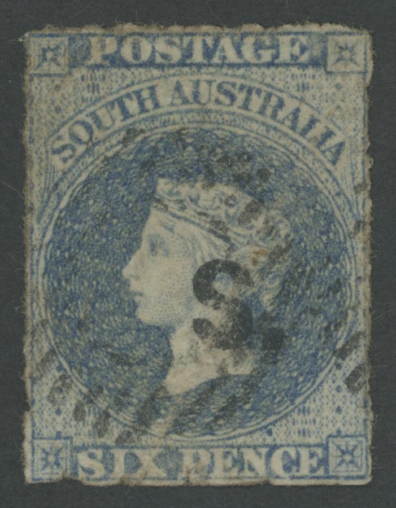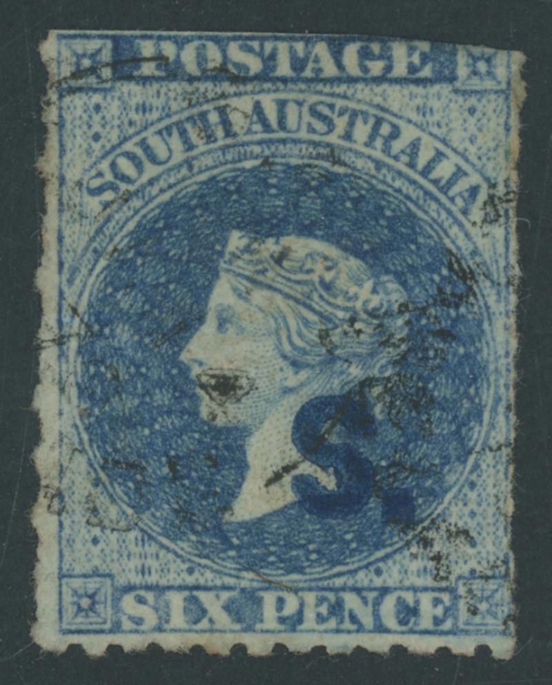 BLACK OVERPRINT: 'S.' on QV Perkins Bacon Large Star Wmk Rouletted 6d dull blue SG DO494, rouletting on all sides, ironed-out diagonal creases but attractive, light GPO circle-in-bars cancel, Cat £1100. Rated RRRR; unrecorded unused. Chris Ceremuga Certificate (2014) states "extremely rare". Don Pearce's very fine example sold for $2395 (Sale 247 Lot 708). [The only confirmed date of use is 30.1.1871] (Image1)