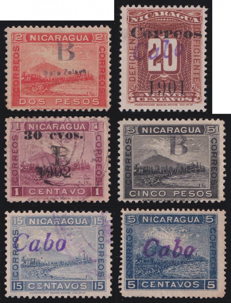 NICARAGUA - ZELEYA PROVINCE: 1904 Bluefields 'B/Dpto. Zeleya' Handstamps selection with a range of different types including on 1900 Engraved 1p orange unused x2, 2p salmon * & used and 5p black * x3, on '30 cvos/1902' Overprint used (unlisted; forgery?), and on 1905 to 50p orange x2 plus 2p green *, also similar selection of Cabo Gracias a Dios 'CABO' Handstamps including on 1900 Engraved set used, 1902 Lithographed 5c used, 10c * & used x3 and 5c on 10c * & used, Italicised 'Cabo' Handstamps on 1900 Engraved set plus extras, 1902 Lithographed 5c & 10c x2 unused, and on Postage Due 'Correos/1901' Overprint 20c brown used, etc, condition a little variable but most are fine to very fine, none have been expertised, so necessarily offered strictly 'as is'.