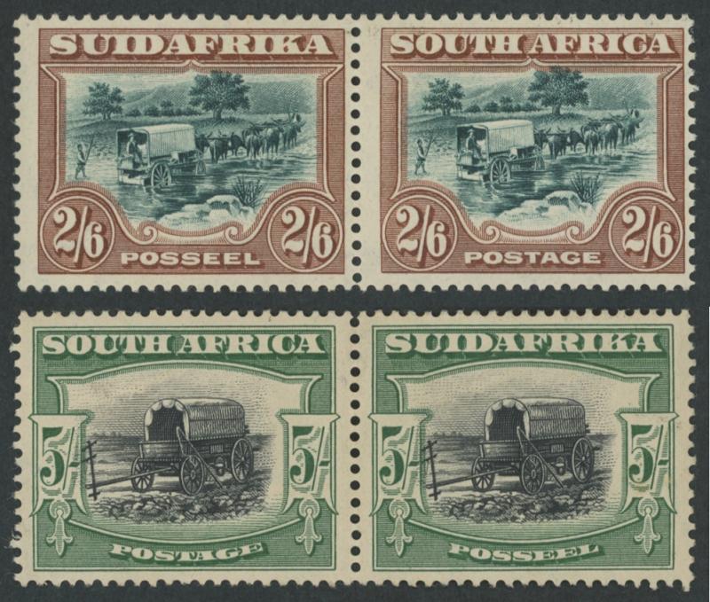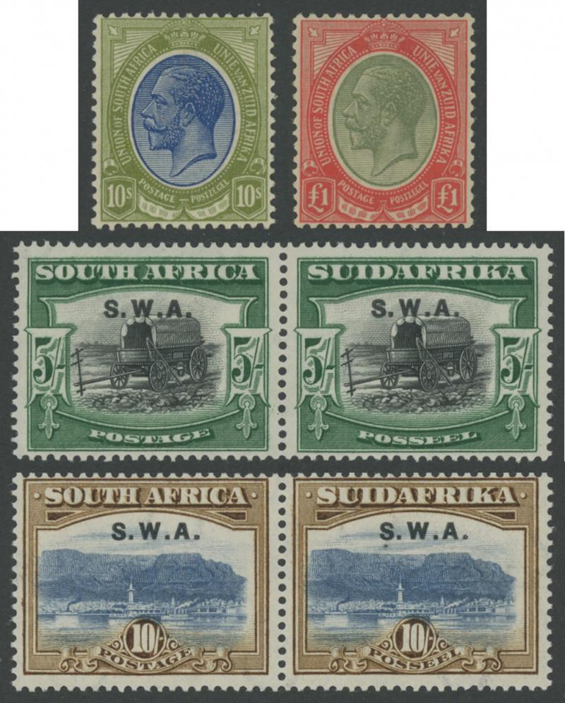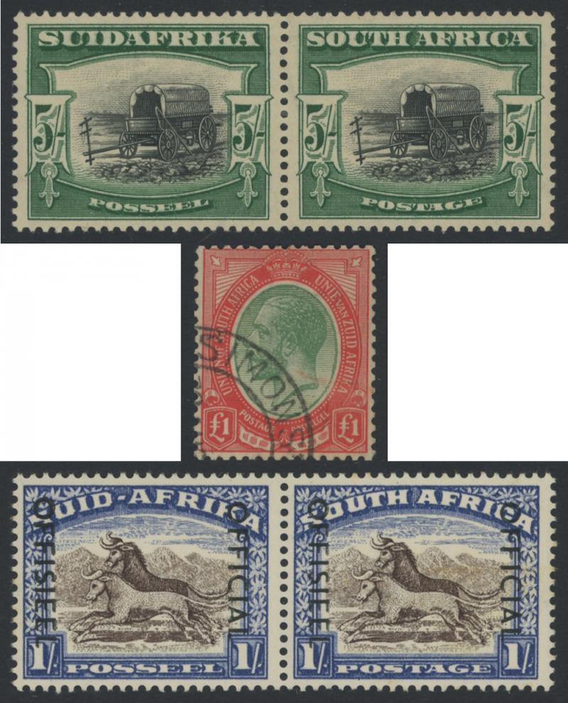 Collection to 1960s predominantly mint from 1910 Union and a few KGV Heads including 1½ Tete-Bêchê pair used, £1 used and Coils set *, then 1925 Airmails, 1926 Small Pictorials trio * & used, 1927-30 Recess Pictorials horizontal pairs set * plus Perf 14 1/- block of 4 and Perf 14x13½ 2/6d, 5/- (rejoined) & 10/- pairs used, 1930-44 Rotogravure Pictorials pairs range including Watermark Upright 3d black & red and 6d Orange Tree, 1933-48 Pictorials pairs including 2d blue & violet, 2d grey & dull purple, 6d Orange Tree Die I & Die II, and 10/- blue & sepia and 10/- blue & charcoal, 1935 KGV Jubilee pairs * & used plus set all with Spots Above Head *, 1936 M/S duo with Exhibition cancels, 1947 Pictorials pairs set plus shades and 5/- Type II, 1954 Animals, 1959-60 Coat of Arms Wmk & 1961 New Currency sets * plus a range of Plate Number & other marginal blocks of 4 ** up to R1 blocks x4, also Officials including 1929-31 Recess Pictorials pairs 2d Perf 14x13½, 1/- & 2/6d, 1930-47 Pictorials 2/6d blue & brown pair, and 1950-54 Pictorials pairs 1/- black-brown & ultramarine, 5/- black & blue-green, 5/- black & pale blue-green Type II, and 10/- x2 * plus 10/- pair used, etc, condition generally fine to very fine, Cat £6500+.