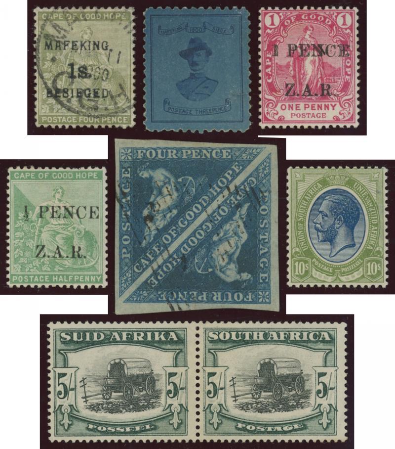 Selection including Cape of Good Hope 1853 Triangles Perkins Bacon Printings Lightly Blued Paper 4d deep blue pair with good to large margins & light triangle cancel, also Siege of Mafeking Overprints on COGH '1s' on 4d green used (not expertised), General Baden-Powell 3d deep blue/blue unused (small closed tear at right) and Vryburg Boer Occupation 'ZAR' Overprints ½d & 1d * (both with a couple of very minor aging marks; not expertised), then predominantly mint with 1913 KGV Heads to 10/-, 1929 Airmails, 1933-48 Pictorials bi-lingual pairs group including 6d Die I ** & Die II *, 1/- x6 */** in a range of shades, 5/- black & green with the Watermark Inverted *, 5/- black & blue-green block of 4 */**, and 10/- *, 1939 Huguenot pairs *, 1942-44 War Effort */**, and 1947-54 Pictorials range including 2/6d blocks of 4 */** x2 and 5/- pair ** all with Plate Numbers, a little South West Africa, etc, condition a little variable as noted but most are fine to very fine, Cat £4000+.