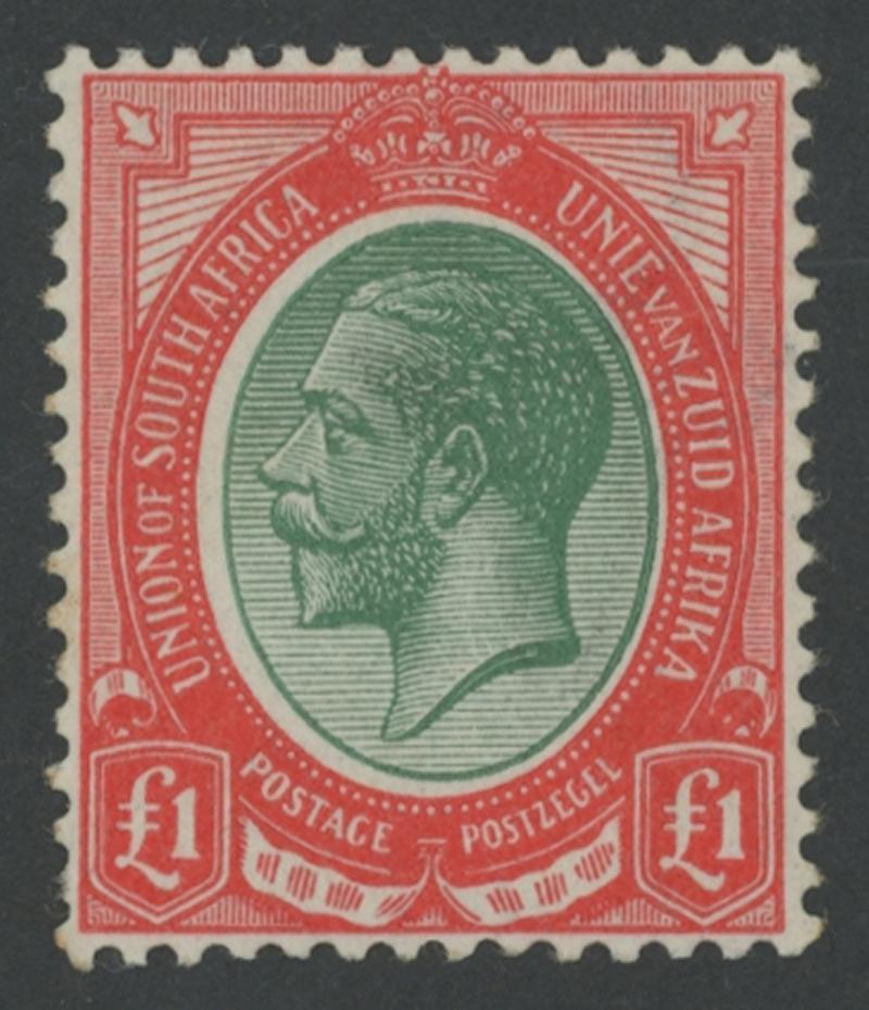 1913-24 KGV Heads £1 green & red SG 17 (Scott 16), well-centred especially for this issue, neat 'BRAAMFONTEIN/JOHANNESBURG' Cat £400 (US$600). (Image1)