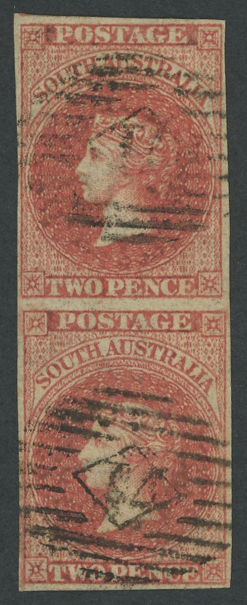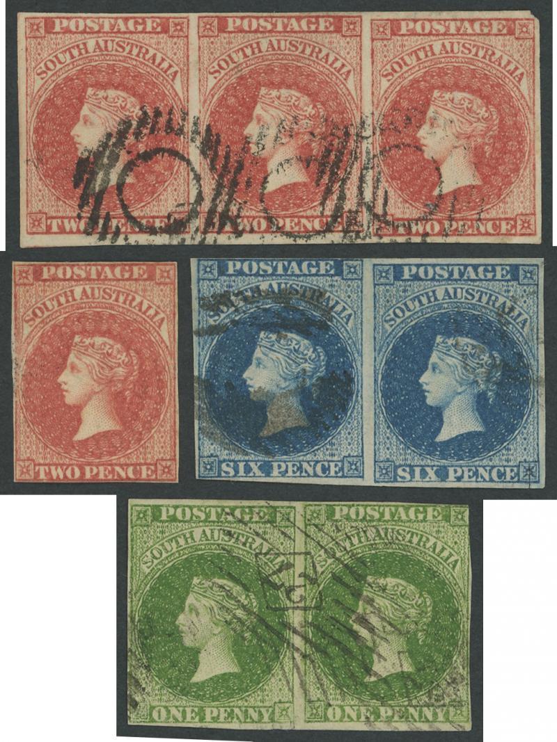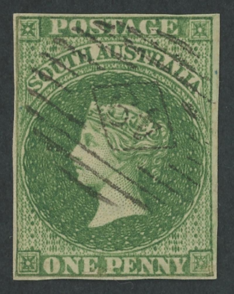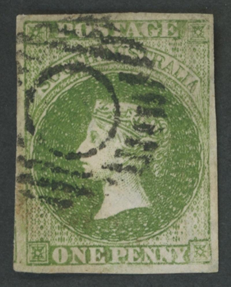 1856-58 QV Perkins Bacon Adelaide Printings 1d yellow-green SG 6, margins close to good, minor blemishes, Cat £600. RPSV Certificate (2007) as the then SG 5. Larger than Don Pearce's dated example that sold for $366. [We are pleased to see that Gibbons have now combined SG 5 & SG 6 - "green" & "yellow-green" - into a single entry, there being little difference in shade. Most examples in the market are, or are likely to be, SG 13 or 14 (now also amalgamated, as SG 13) with the roulettes trimmed-off. Genuine examples of the Imperf Adelaide Penny are much scarcer than the catalogue value would suggest] (Image1)