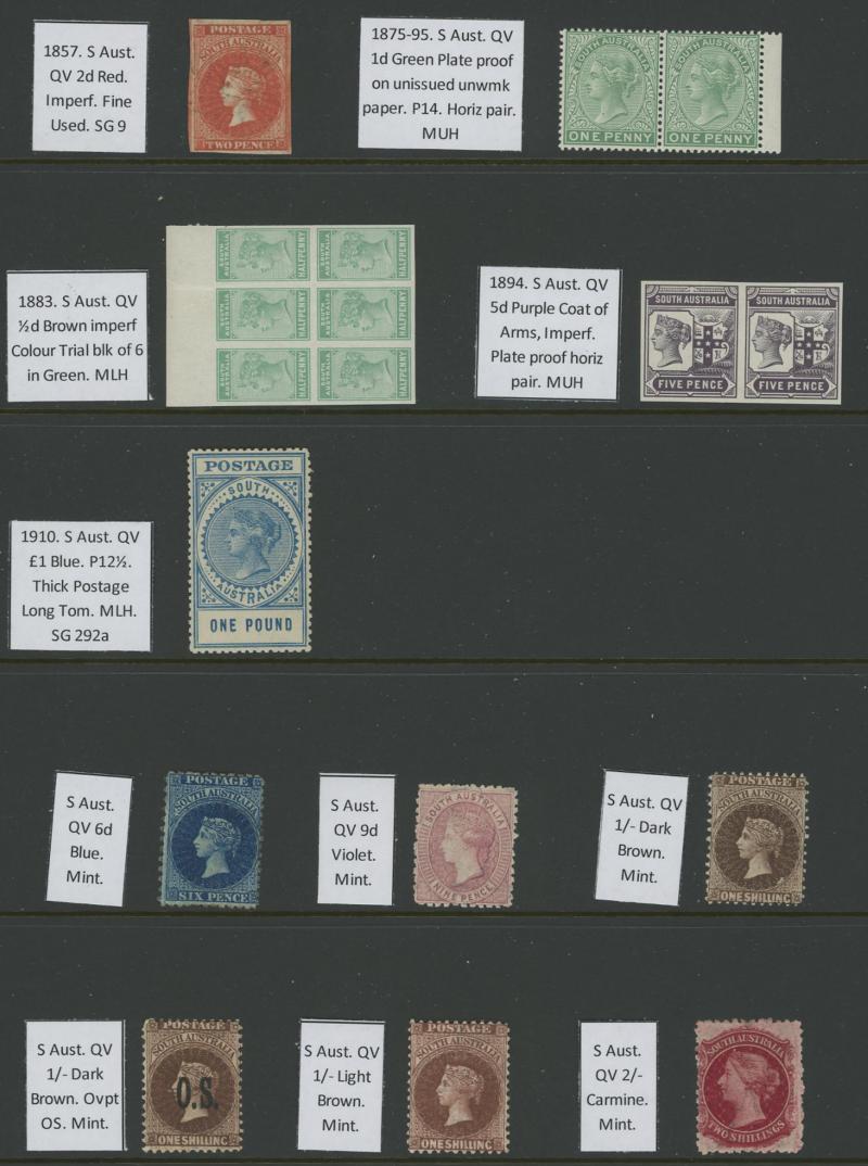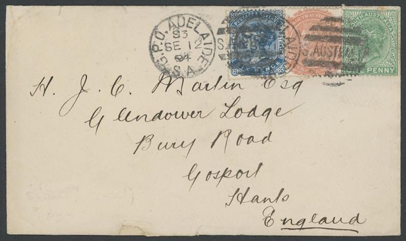 Eclectic group including 1845 very fine stampless entire with lengthy letter headed "Villa Anglo-Australiana North Adelaide" & signed "John Guy" with no postal markings; 1887 Victorian Postal Card with 'ADVERTISED UNCLAIMED/ADELAIDE' datestamp; 1905 PPC of TSS 'Kanowna' with superb 'KLEMZIG' squared-circle (rated RRR); two Education Department registered covers with 'O.S.' Overprints 2d + '2½d' on 4d pair (Cat £50 x50+ on cover) or punctured 'SA' 2d & 5d (defective); group of PPCs (mostly) & covers to unusual destinations including Austria (taxed with 10h Postage Due), Belgium, Brazil, Cape of Good Hope, Ceylon, Denmark x2, Hawaii (stained), Italy x3, Malaya, Mauritius ('OS' ½d Wrapper-front uprated with OS 'HALF-/PENNY' on 1d), Dutch Indies, Portugal & Sweden x2; condition variable but most are fine to very fine.