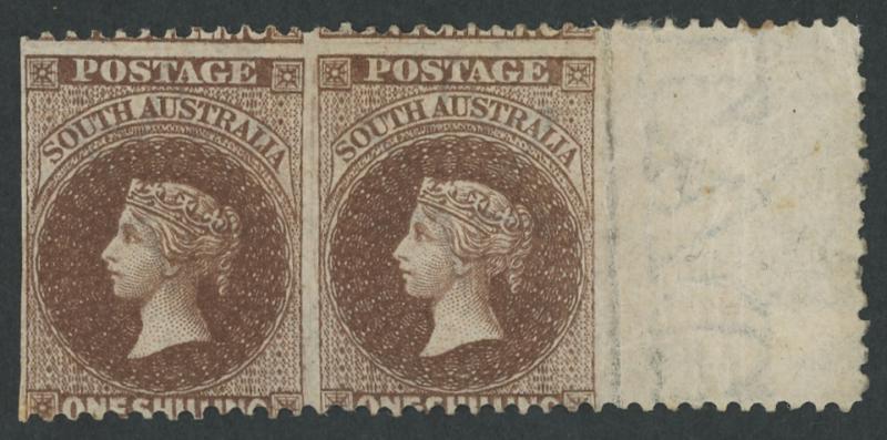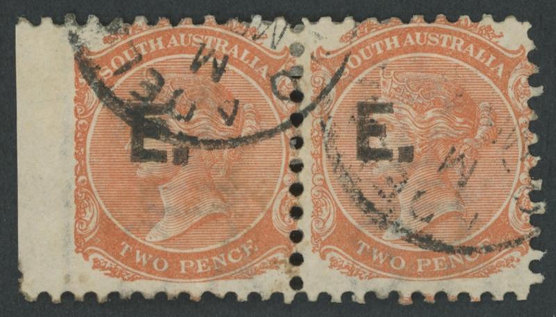 1882-99 New Denominations Crown/SA Watermark Perf 15x11½ 'Bantam' ½d brown pair but Double Perf 15 Between, irregular perfs at the sides, light 'MT GAMBIER/SE--/93/S-A' squared-circle. An extraordinary Irregular Compound Perf variety unlisted by Gibbons, absent from Don Pearce's collection and the only examples known to us. (Image1)
