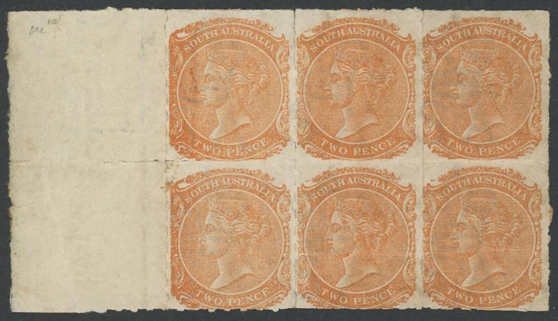 1868-76 QV De La Rue Large Crown/SA Watermark Rouletted 2d dull orange SG 152-153 group with the Watermark Inverted marginal block of 6 (3x2) from the left of the sheet, full rouletting, slightly discoloured from the large-part (brown) o.g., Cat £1080+ for singles. A rare multiple. Ex Don Pearce: sold for $915. (Image1)