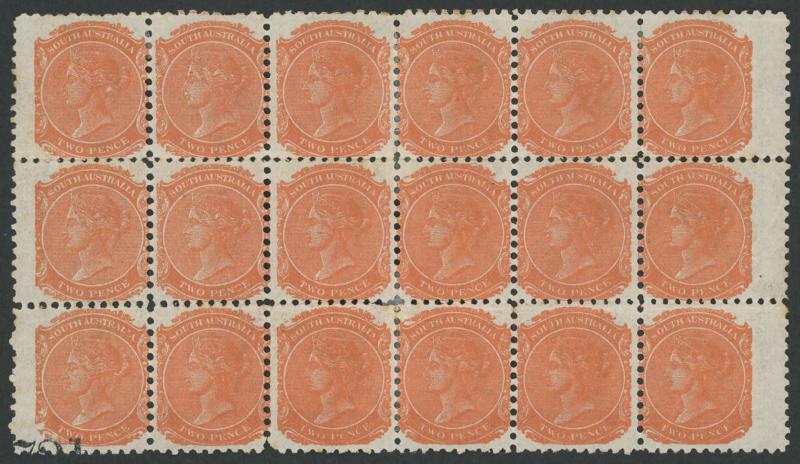 1876-1904 QV De La Rue Narrow Crown/SA Watermark 2d orange Perf 10 SG 168 block of 18 (6x3) with wing-margins at left & right and partial Sheet Number '...721' in black printed on the face of the lower-left unit, a couple of units in the top row with uneven/shortish perfs, a few minor aging marks on the reverse, some uneven gum with a few light bends & a diagonal crease affecting the two lower units in the right-hand column, minor perf reinforcing & hinge remainders but many units are unmounted, Cat £990+ for mounted singles. A very scarce multiple. (Image1)