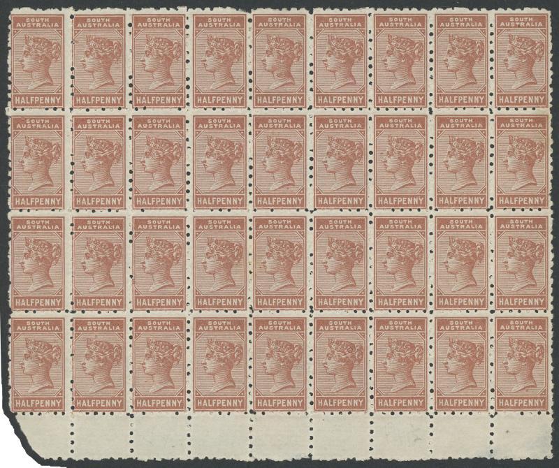 1882-99 New Denominations Crown/SA Watermark Perf 11½-12½ 'Bantam' ½d red-brown SG 187 marginal block of 36 (9x4) from the base of the upper pane, generally well-centred, characteristic rough perfs, virtually full original gum with most units being unmounted, Cat £1620+ for mounted singles. Don Pearce's Perf 10 SG 182 block of 60, Cat £1140+, sold for $1465. (Image1)