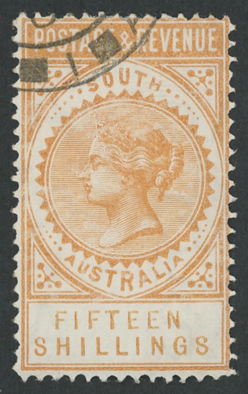 1886-96 QV De La Rue Tall Stamps 'POSTAGE & REVENUE' 15/- brownish yellow Perf 11½-12½ SG 198a, CTO with Adelaide double-ring cds corner cancel, Cat £275 for used. (Image1)
