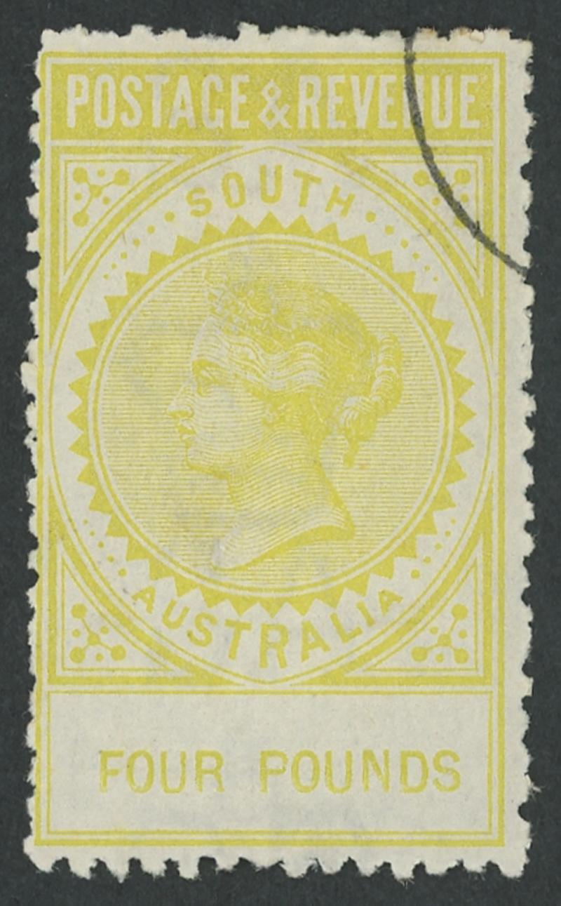 1886-96 QV De La Rue Tall Stamps 'POSTAGE & REVENUE' £4 lemon Perf 11½-12½ SG 203a, CTO with Melbourne single-ring cds corner cancel, characteristic rough perfs, large-part gum, Cat £1400 for used. (Image1)
