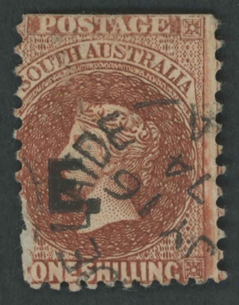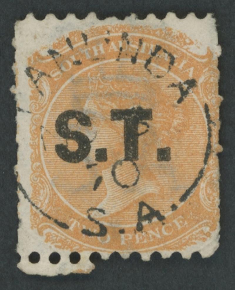 'S.T.' of the SUPERINTENDENT OF TELEGRAPHS: in Black on De La Rue Perf 10xRouletted 2d dull orange SG DO549, very fine 'TANUNDA/NO6/70/S.A' cds, under-catalogued at £120. Rated RRR: unrecorded unused. [Date range 1.11.1870 to 4.1.1871: only two months] Far superior to Don Pearce's example - corner fault - that sold for $137. Chris Ceremuga Certificate (2008) states "very rare". (Image1)