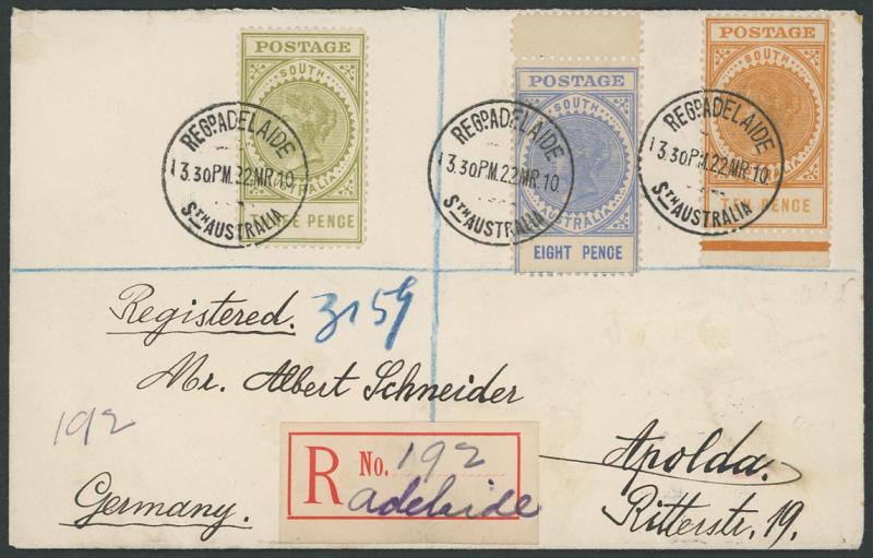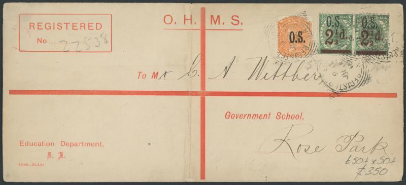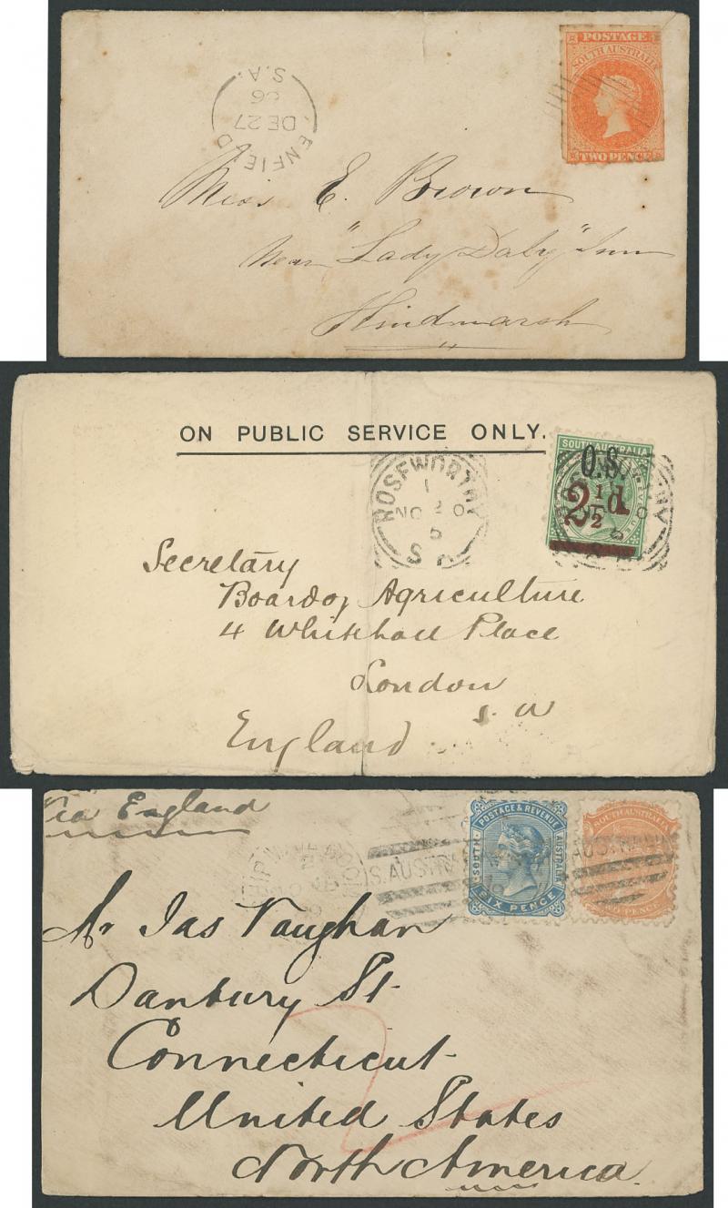 Group including 1866 to Hindmarsh with Perkins Bacon 2d tied light numeral cancel and very fine 'ENFIELD/SA' cds alongside, 1882-84 to England (3) "via Naples" each with 2d orange x3, 1889 to USA with 2d orange & 6d blue, 1890 mourning cover to Sydney endorsed "Per Express" with DLR 2d orange solo, 1894 Private Secretary's Office handstamp on cover with 2d orange 'OS' overprint, 1895 OPSO to London with '2½d' on 4d green 'OS' overprint solo, 1902 Temperance & General Mutual Life envelope with 1d red for printed matter rate, 1903 PPC to England forwarded with KEVII ½d added, 1906 PPC to Constantinople, 1906 PPC to USA forwarded with 1c Franklin added, 1908 Attorney-General OHMS to USA with 2d violet punctured 'SA' solo taxed & Postage Due 2c affixed, 1909 PPC to Begium with 1d red solo & 10c Due, used postal stationery including Postal Cards 1d brown overprinted 'OHMS', Wrappers ½d violet uprated by ½d & 1d to London and by 2d orange to Switzerland, ½d violet 'OS' overprint used locally, 1d green to Germany & England (plus one unused), etc, also 1900s inwards cover from USA unfranked with large '5' tax marking and postcard from Germany with ½d & 2d Postage Dues, condition mixed but most are fine to very fine.