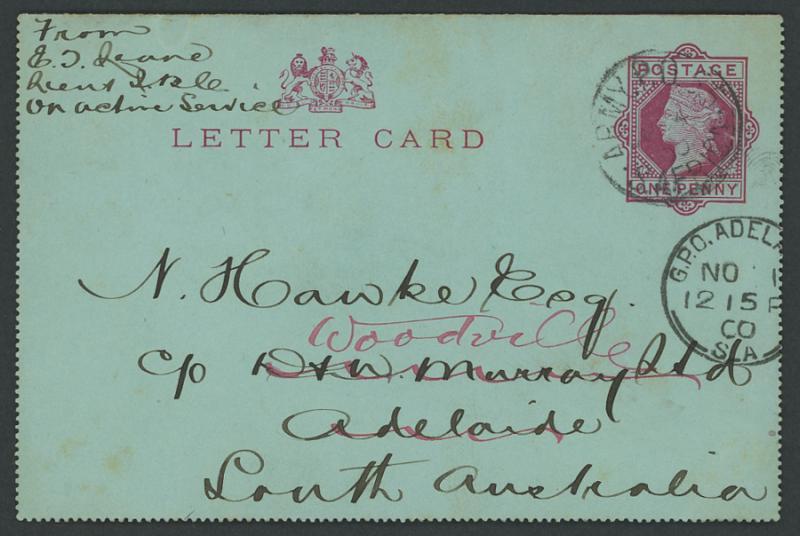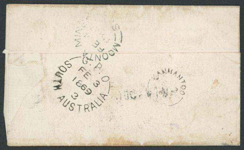 1869 (Jan 22) largely-printed lettersheet to "Kanmantoo" with 21mm arrival backstamp (rated RRRR) & superb 'UNCLAIMED' handstamp, endorsed at left "Try Moonta Mines/Wallaroo or/Kadina" with 25mm unframed 'MOONTA MINES=S.A=' (RR), superb 30mm 'G P O/FE3/1869/ 3 /SOUTH AUSTRALIA' backstamp (ERD) & very fine 'DEAD LETTER/ADELAIDE' cds on the face, minor blemishes. (Image1)