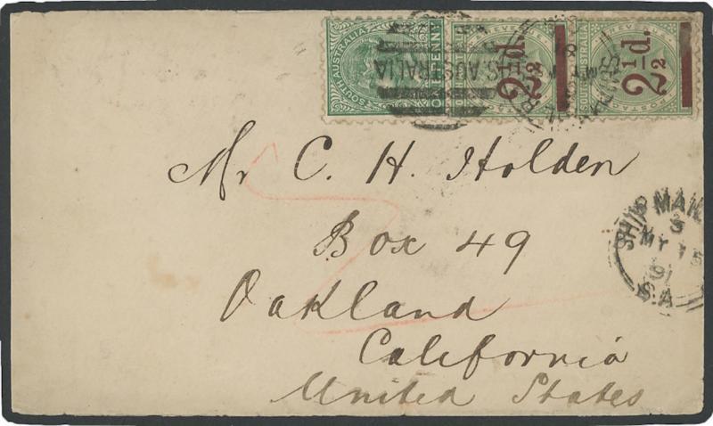 1891 (May 15) cover to California with extremely rare franking of Irregular Compound Perf 10x11½-12½ x10x10 '2½d.' on 4d SG 231 variant vertical pair & 1d blue-green tied by 'SHIP MAIL ROOM/S.A - S AUSTRALIA' duplex, apparently missent (?) via London with New York transit backstamp of JUL5/91. Harry Lower stated this is the only cover recorded with this stamp. [The 6d rate to America was reinstated by mid-February, until 30.9.1891, after which the Colonies did join the UPU] (Image1)