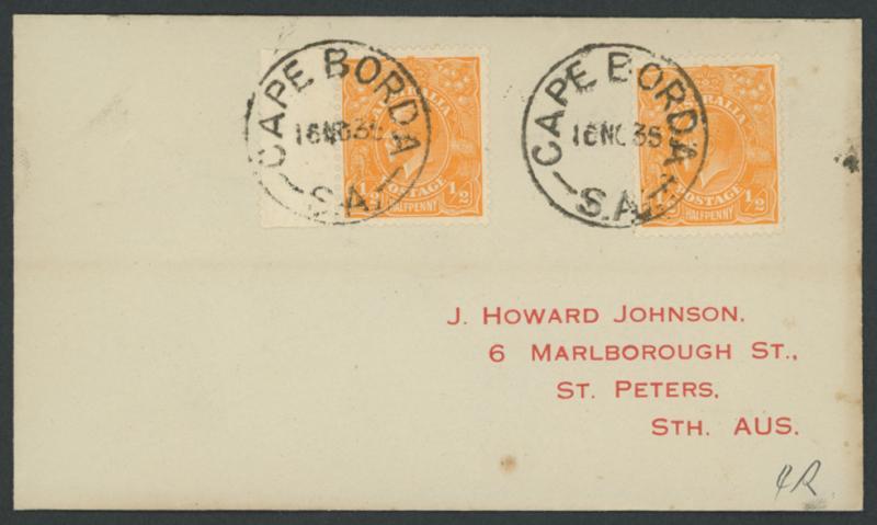 Cape Borda: 'CAPE BORDA/16NO35/S.A.' cds (during second TO period) two very fine strikes on KGV ½d orange x2 on Howard Johnson registered cover, minor tonespots. Rated RRRR. TO 15/8/1876; PO 1/4/1877; TO 31/3/1917; closed 31/1/1966. Ex John Bell (Adelaide): sold at our auction of 14.11.2014 for $498 (Sale 198 Lot 2621). [Kangaroo Island] (Image1)
