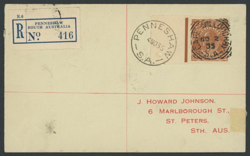 Cape Willoughby: 'CAPE WILLOUGHBY/NO2/35/S-A' squared-circle (during the second TO period) largely very fine strike on KGV 5d on Howard Johnson cover, superb 'PENNESHAW/ 4NO35/S.A.' alongside & blue/white registration label. Rated R, but very rare in the TO period. TO 11/5/1880; PO 1/7/1883; TO 31/3/1917; closed 5/9/1967. Ex John Bell (Adelaide): sold at our auction of 14.11.2014 for $308 (Sale 198 Lot 2622). NB: Telephone Offices had no registration facilities. [Kangaroo Island: at the lighthouse] (Image1)