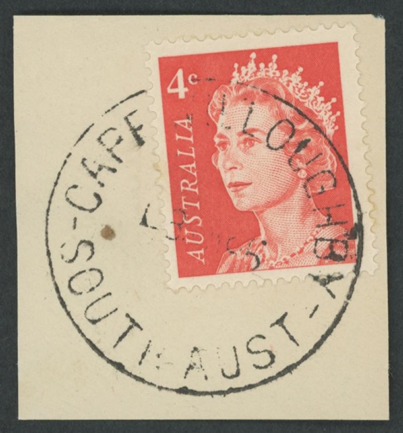 Cape Willoughby: 'CAPE WILLOUGHBY/3--66/SOUTH AUST' cds (TO period; LRD) largely very fine strike on QEII 4c on commercial piece. Rated RRRR.. TO 11/5/1880; PO 1/7/1883; TO 31/3/1917; closed 5/9/1967. Ex John Bell (Adelaide): sold at our auction of 14.11.2014 for $178 (Sale 198 Lot 2546). [Kangaroo Island: at the lighthouse] (Image1)