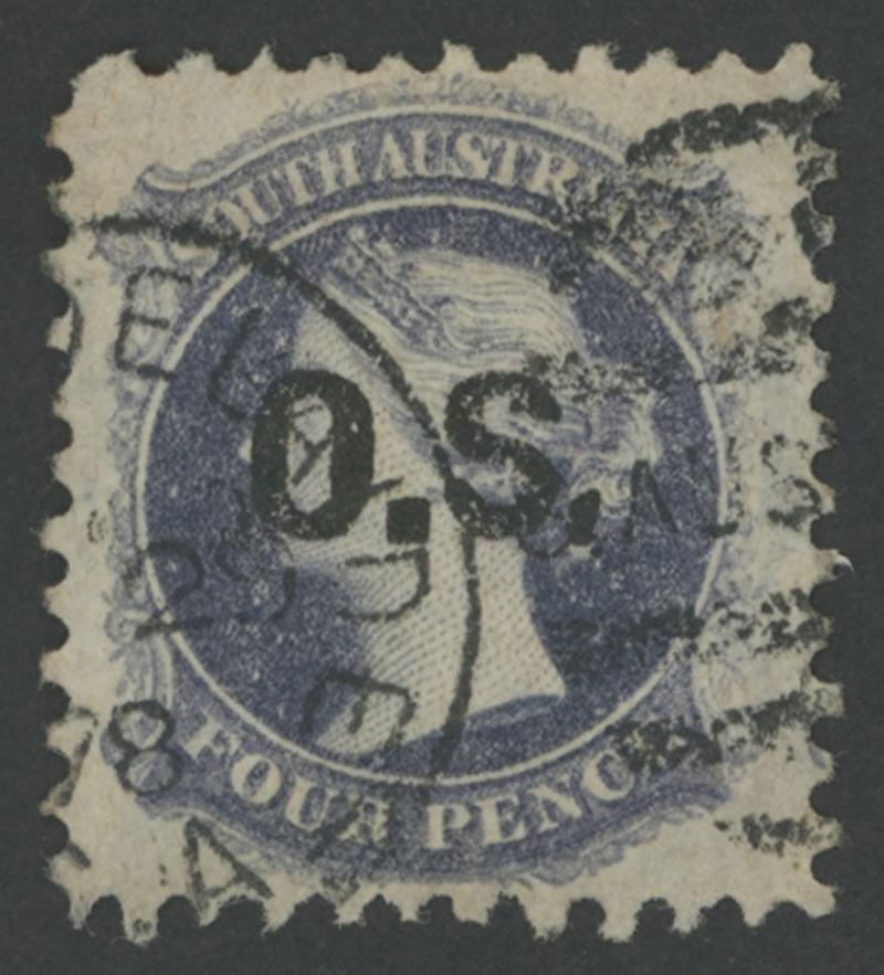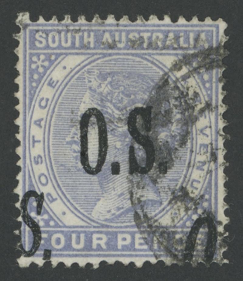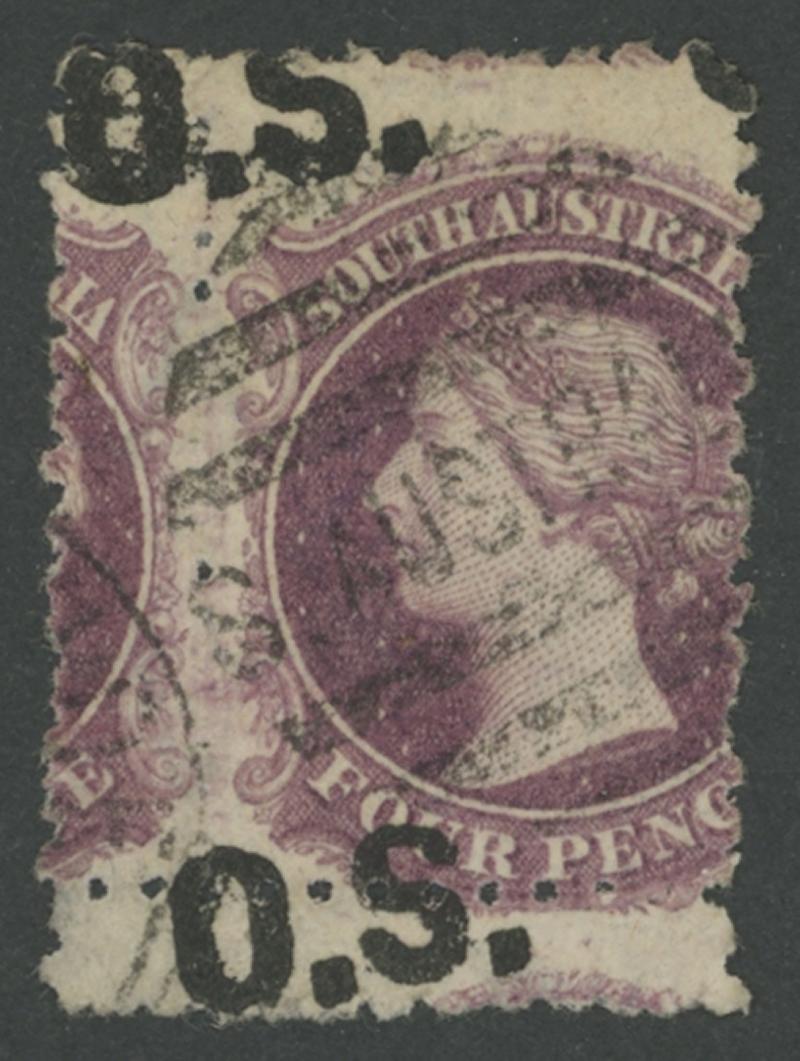 OVERPRINTED THIN 'OS': 1891-99 QV De La Rue Perf 15 4d lilac with 'O.S.' Double One Diagonal SG O66a, untidy cancel, Cat £750. Don Pearce's example sold for $749 (Sale 249 Lot 1491). Only three used examples recorded. (Image1)