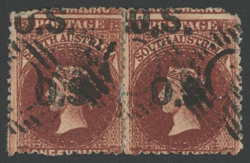 OVERPRINTED THICK 'OS': 1874-77 QV Perkins Bacon Large Star Wmk Perf 11½-12½ 1/- red-brown with Double Overprint SG O12a horizontal pair, minor separation faults at upper-left & upper-right, circle-in-bars cancels of the GPO, Cat £800+ for singles. Gary Diffen stated only two pairs & a strip of 3 have been recorded. His very similar but fine pair sold for £456. (Image1)