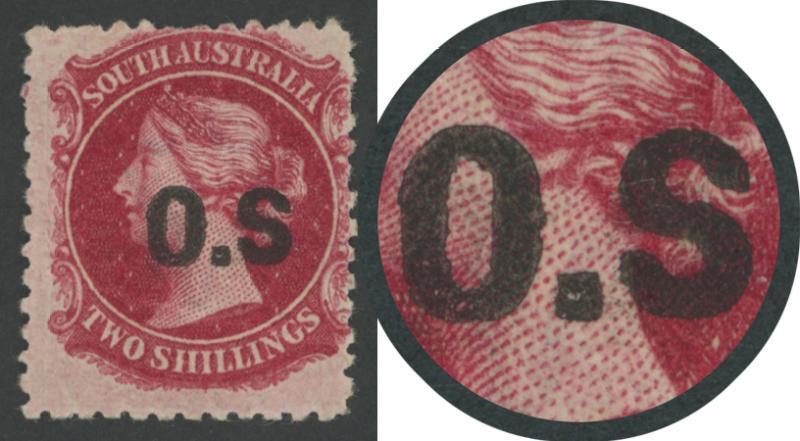 OVERPRINTED THICK 'OS': 1874-77 QV Perkins Bacon Large Star Wmk Perf 11½-12½ 2/- deep carmine with No Stop after ‘S ‘ of ‘O.S.’ SG O13a, light horizontal bend not evident from the face, large-part gum, unpriced unused by Gibbons; £160 for used. Absent from Gary Diffen’s and Don Pearce’s collections. (Image1)