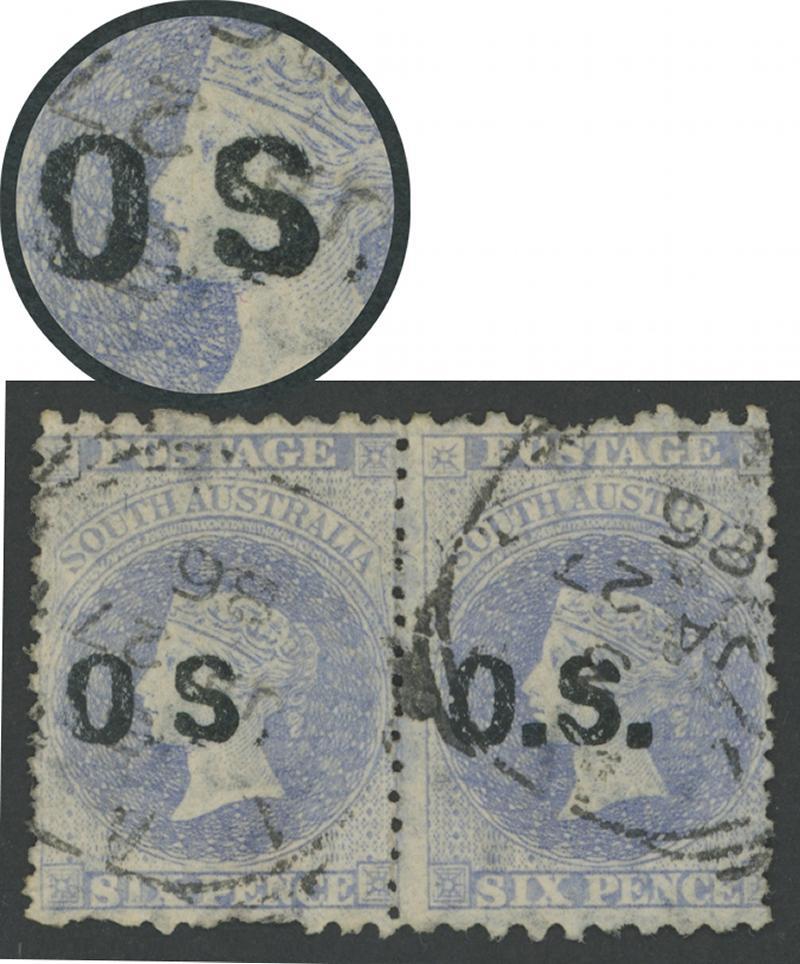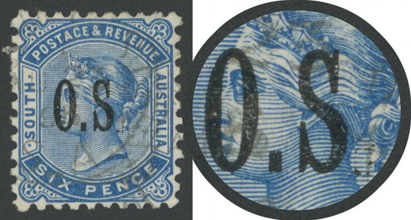 OVERPRINTED THIN 'OS': 1891-99 QV De La Rue Perf 10 6d blue with No Stop after 'S ' of 'O.S.' SG O62a, exceptional centring, lightly cancelled, Cat £500. Superior to Don Pearce's example that sold for $359 (Sale 249 Lot 1487). (Image1)