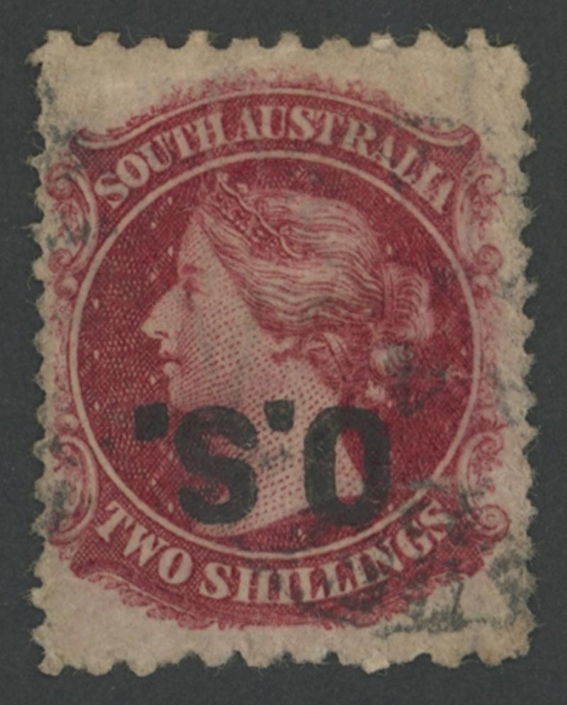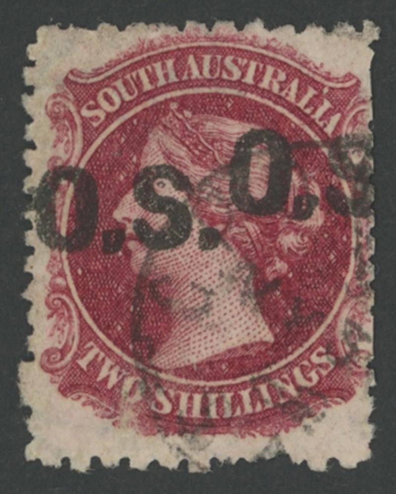 OVERPRINTED THICK 'OS': 1876-85 QV Perkins Bacon Broad Star Wmk Perf 11½-12½ 2/- deep carmine with the Overprint Double SG O29a, several short perfs, GPO cds largely clear of the overprints, Cat £1000. Sold at our auction of 14.11.2014 for $950 (Sale 198 Lot 2034). RPSV Certificate (2015). Gary Diffen recorded only three used examples in private hands. Don Pearce's example sold for $1135 (Sale 249 Lot 1464). (Image1)