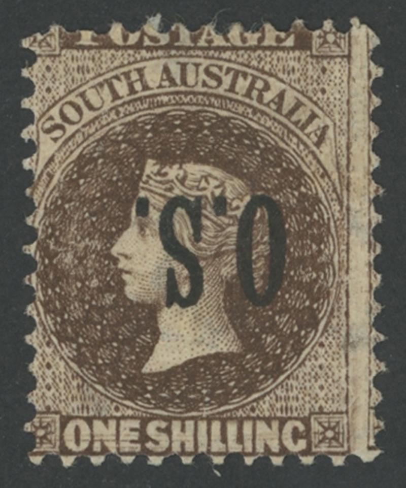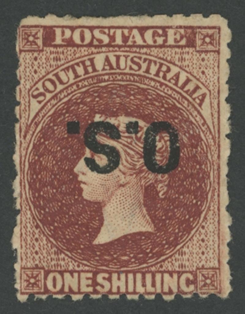 OVERPRINTED THICK 'OS': 1876-85 QV Perkins Bacon Broad Star Wmk Perf 11½-12½ 1/- red-brown with Overprint Inverted SG O27a, large-part gum, Cat £1000. Ex Don Pearce: sold for $868 (Sale 249 Lot 1461). Gary Diffen recorded only three unused examples: his stamp sold for £480. (Image1)