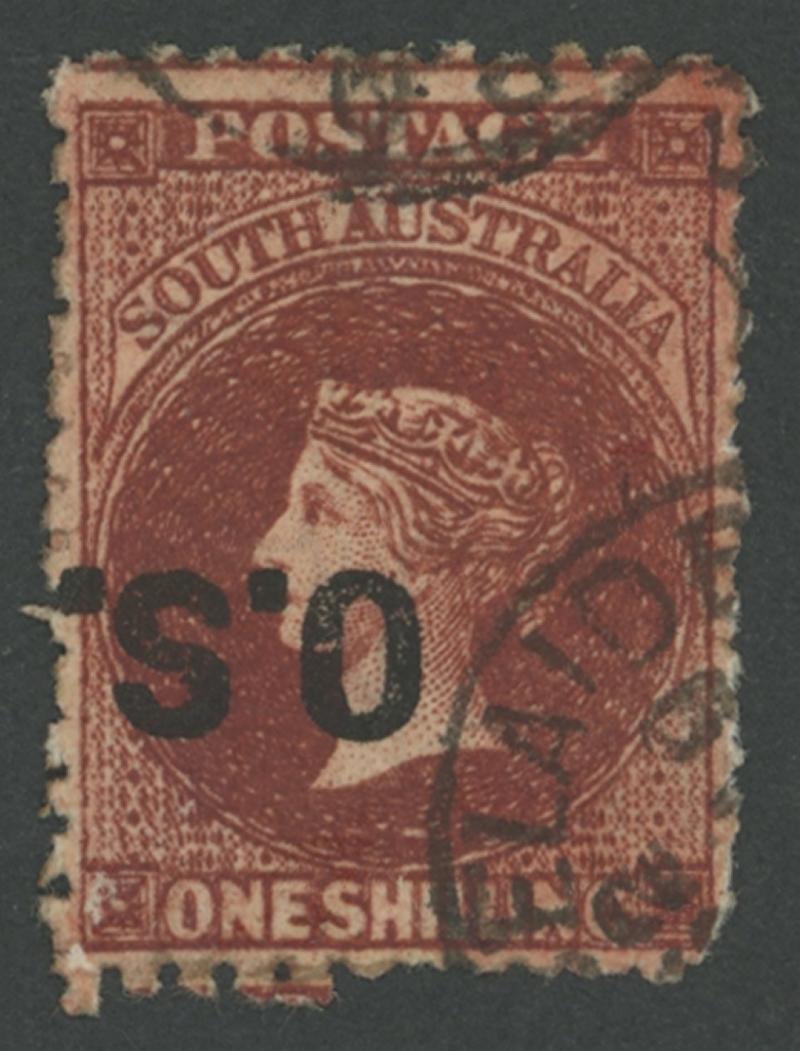 OVERPRINTED THICK 'OS': 1876-85 QV Perkins Bacon Broad Star Wmk Perf 11½-12½ 1/- red-brown with Overprint Inverted SG O27a, GPO cds clear of the overprint, Cat £500. Gary Diffen recorded ten used examples: his less attractive stamp sold for £288. (Image1)