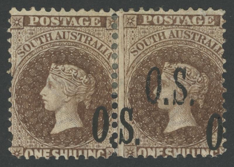 OVERPRINTED THIN 'OS': 1891-1902 QV Perkins Bacon Broad Star Wmk Perf 11½-12½ 1/- sepia with Large Holes horizontal pair, the first unit with 'O.' Only and the second unit with the normal overprint plus parts of Two Misplaced Overprints SG O33a variant, large-part gum, Cat £1000+ for a normal used double overprint: not priced mint. A remarkable error. Absent from Gary Diffen's and Don Pearce's collections. (Image1)