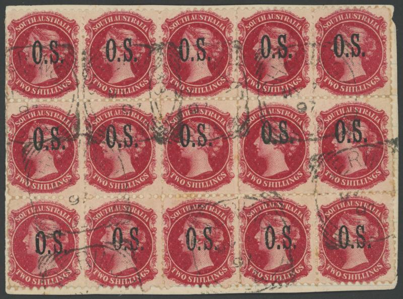 OVERPRINTED THIN 'OS': 1891-1902 QV Perkins Bacon Broad Star Wmk Perf 10x11½-12½ 2/- crimson SG O35 block of 15 (5x3) well-centred, tied to thin card from a homemade packet by light 'SHERINGA/MY--/97/SA' squared-circle cancels, Cat £150+ for singles. Used multiples of this size, of any denomination, are rarely seen. Ex Don Pearce: sold for $1315 (Sale 249 Lot 1475). (Image1)