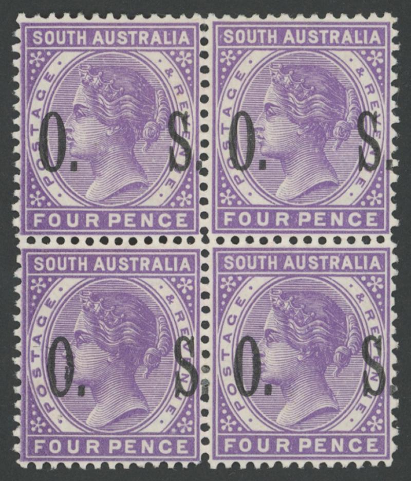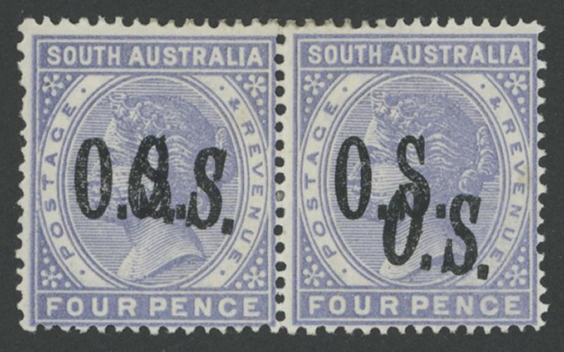 OVERPRINTED THIN 'OS': 1891-99 QV De La Rue Perf 15 4d lilac with 'O.S.' Double One Diagonal SG O66a horizontal pair, well-centred, large-part gum, Cat £1200+ for singles. A striking error. Ex Don Pearce: sold for $1198 (Sale 249 Lot 1490). Gary Diffen recorded only a block of 8, discovered in the late-1980s, later reduced to two singles and three pairs. Superior to his pair - the right-hand unit with rounded corner at upper-right - that sold for £480. (Image1)