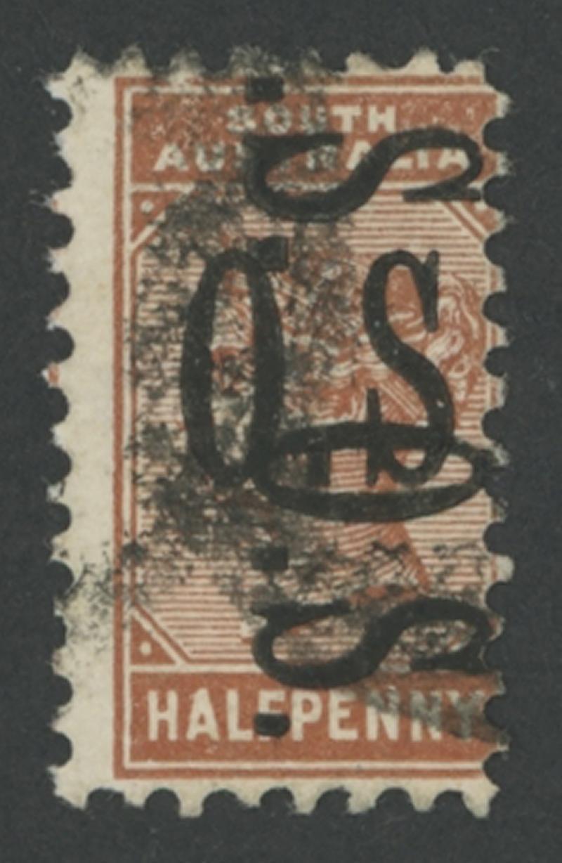 OVERPRINTED THIN 'OS': 1891-99 QV De La Rue Perf 13 'Bantam' ½d pale brown with Overprint Triple Twice Sideways SG O68a, untidy cancel, Cat £500. Gary Diffen recorded only his similarly cancelled pair that sold for £480. This stamp almost certainly adjoined the pair at right. (Image1)