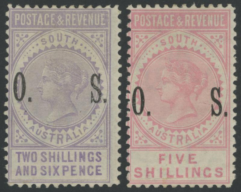 OVERPRINTED THIN 'OS' WIDE SETTING: 1891 QV De La Rue Tall Stamps 'POSTAGE & REVENUE' Perf 10 2/6d pale violet and 5/- pink SG O86-87, the 2/6d with a light horizontal bend at the base which is a characteristic of these stamps and the 5/- with two faint horizontal crease at left none of which affect the very fine facial appearance, CTO with unframed 'GPO ADELAIDE' cds, Cat £14,000. The 2/6d is Ex 'Besancon' (III): sold for SFr3415 and the 5/- is Ex 'Besancon' (I) sold for SFr8470, a combined SFr11,885. Chris Ceremuga Certificate (2018) for the 2/6d. Only one sheet of 60 of each was issued. In our experience, and despite the relative Gibbons valuations, CTO examples are much scarcer than mint stamps. (2) (Image1)