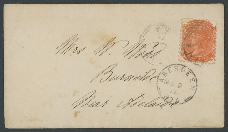 Aberdeen: 'ABERDEEN/MA2/76/S A' very fine transit on face of cover from 'YATINA' to "Burnside/Near Adelaide", 'BURNSIDE/MR2/1876/S . A' arrival backstamp (rated RRRR), minor blemishes. Rated RRRR: absent from Don Pearce's collection. PO 1874; renamed Burra North 1.12.1939. Ex John Boykett. (Image1)
