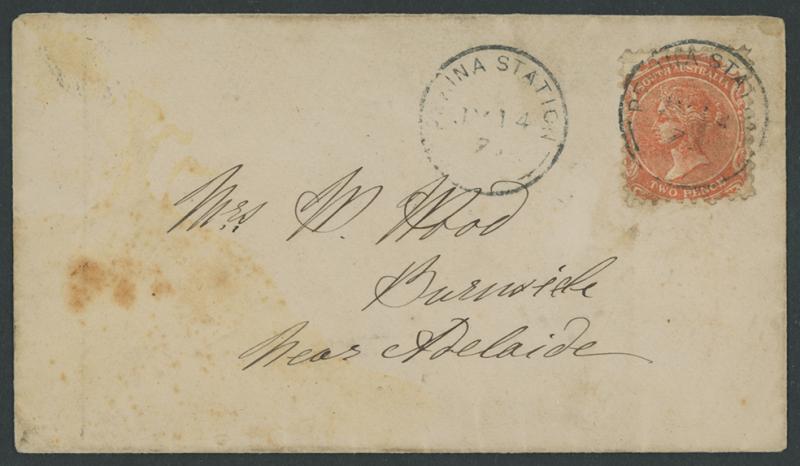 Orroroo: 'PEKINA STATION/JY14/76/[SA]' two large-part strikes on cover to "Burnside/Near Adelaide", the reverse with 'KOORINGA' and 'RAILWAY/ 2 /SA' transits and 'BURNSIDE/JY20/1876/S . A' arrival (rated RRRR), light toning. Rated RRRRR: the only recorded examples. Pekina Station 1.6.1876; renamed Orrorroo 1.7.1876. Illustrated in the Handbook under Pekina Station. Ex John Boykett. (Image1)