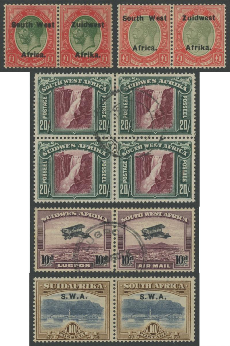 Predominantly mint collection to 1960s from 1923 'Zuid-West' Hyphenated Overprints 14mm Spacing on South Africa KGV Hears bi-lingual pairs set to 5/- (ex 2d) * plus 10mm Spacing 5/- pair *, 'Zuidwest' Overprints 14mm Spacing set to 5/- (ex 1/-) * plus 5/- purple & deep blue pair * and 9½mm Spacing ½d to 5/- plus £1 green & red and £1 pale olive-green & red pairs *, 1927 Overprints on Pictorials pairs set * plus 10/- pair used, 1927 'SWA' Overprints on KGV £1 and on Pictorials pairs set *, then 1931 Pictorials & Airs pairs set * (the 3d Windhoek used) plus Pictorials blocks of 4 ** & used (ex ½d, 1/3d & 2/6d) and Airs 10d pair used, 1935 Silver Jubilee set used, 1954 Pictorials ** & used and in blocks of 4 **, 1961-63 Pictorials Arms Wmk, 1962-66 No Wmk, 1966-72 'RSA' Wmk & New Values sets and 1970-71 Redrawn trio all in blocks of 4 **, 1974 & 1975 Rare Birds sets in blocks of 6 **, etc, also a range of Officials including 1938 1½d block of 4 */** and 1952 pairs set (ex 2d) used, condition generally fine to very fine, Cat £5500+.