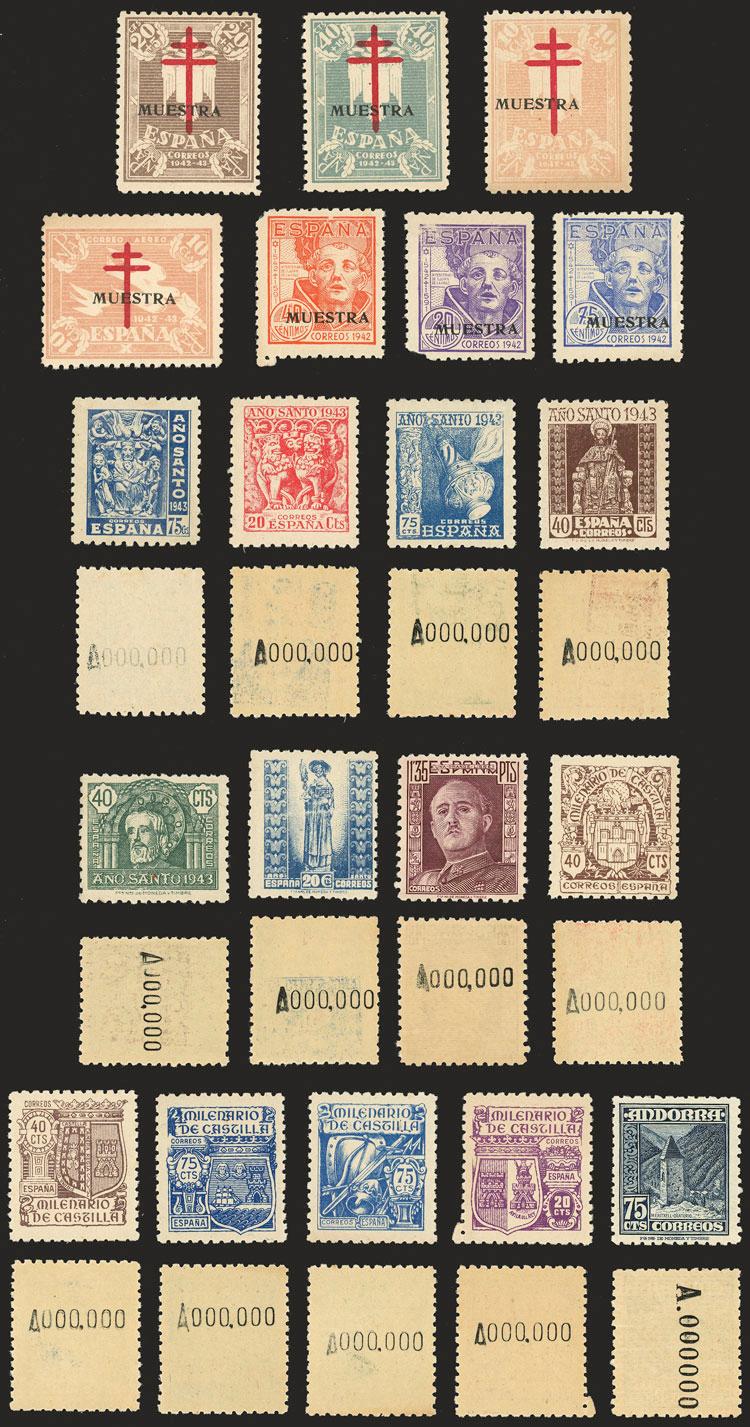 SPECIMENS: 12 Spanish stamps + 1 of Andorra, from 1940s, with numbering "A000.000" on back + other 7 without numbering on back, overprinted "MUESTRA" on front, about 3 with small defects, the rest MNH and of excellent quality! (Image)